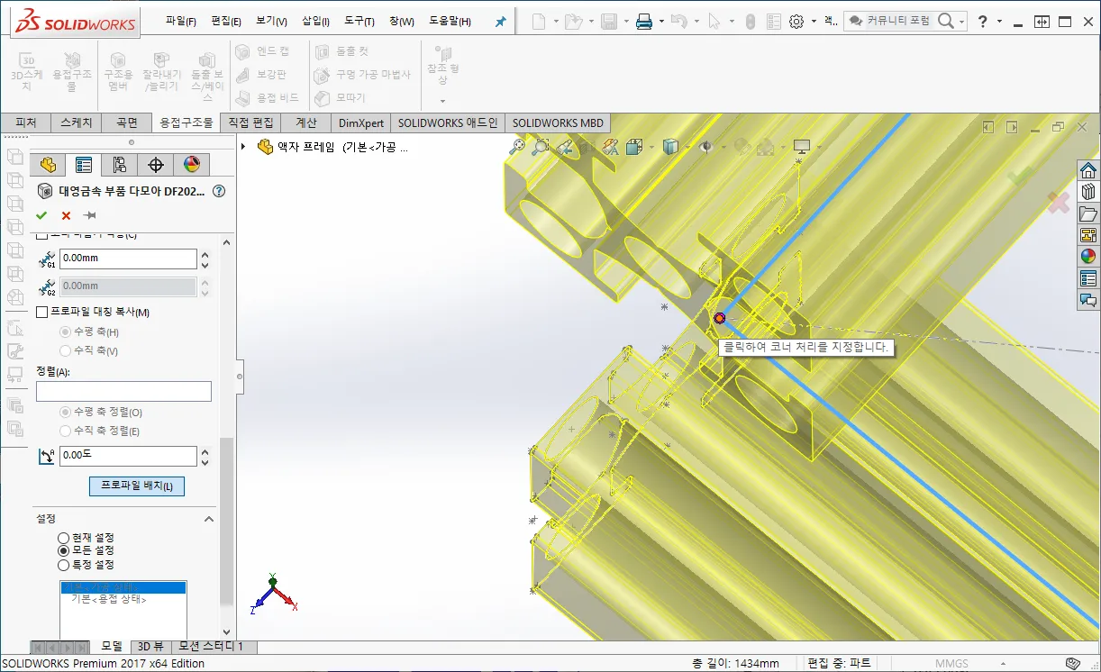 용접구조물의 프레임 구조 단면은 위에서 다운로드한 프로파일 단면을 솔리드웍스 용접 구조물에 사용할 수 있도록 변경해서 적용한 것이며, 이 부분에 대해서는 다음에 별도로 포스팅하도록 하겠다.