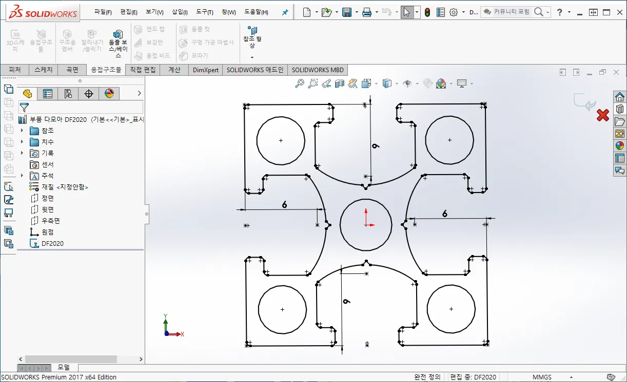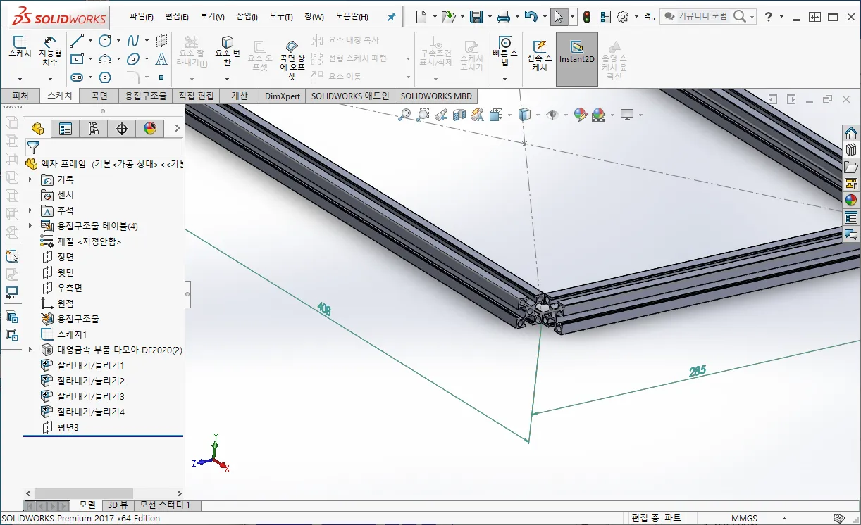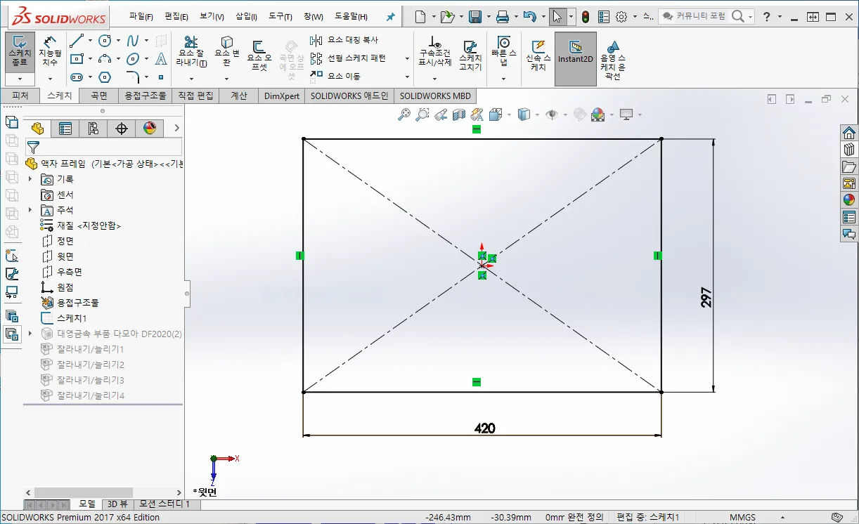이미 완성된 도면이 이여서, 별도의 형상이나 치수 구속은 필요하지 않지만, 솔리드웍스의 용접 구조물을 이용한 프레임 작성하기 때문에 기준이 되는 점의 위치를 잡아준다.