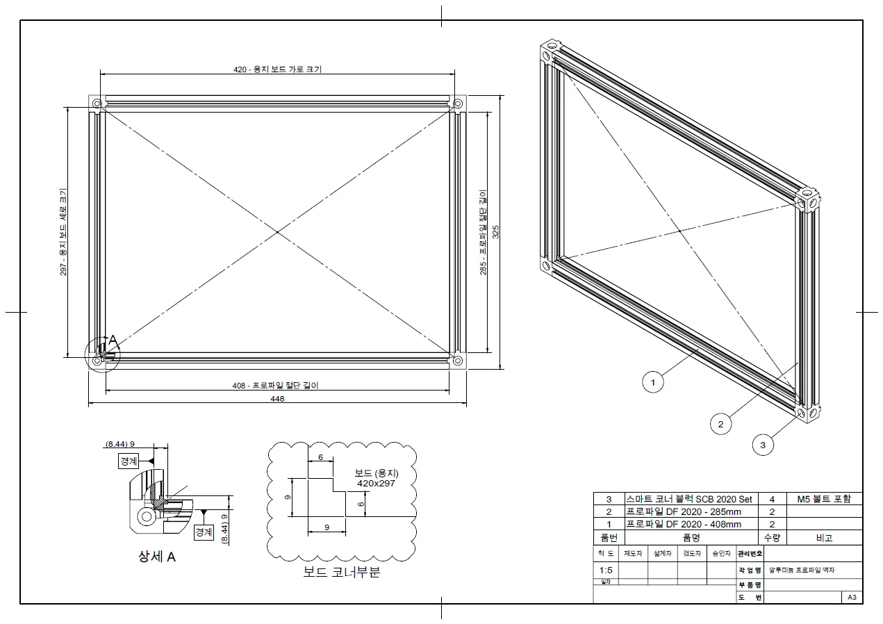 도면과 같이 프로파일은 2020 규격으로 가로, 세로 20mm로 된 프로파일을 이용하고, 조립되는 코너 블록도 SCB 2020으로 프로파일에 딱 맞는 제품으로 구성하도록 도면을 작성하고 크기를 체크했다.