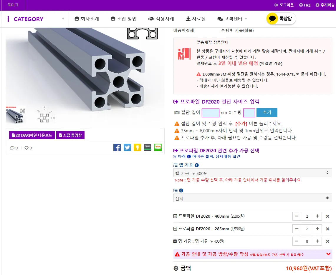 이 부품 다모아에서는 프로파일 길이를 mm단위로 계산할 수 있으며, 길이에 따라 계산되고, 직접 길이를 입력하기 때문에, 직관적으로 주문할 수 있어서, 다른 유사한 프로파일 관련 쇼핑몰보다는 훨씬 편리하다.