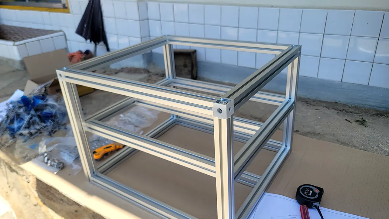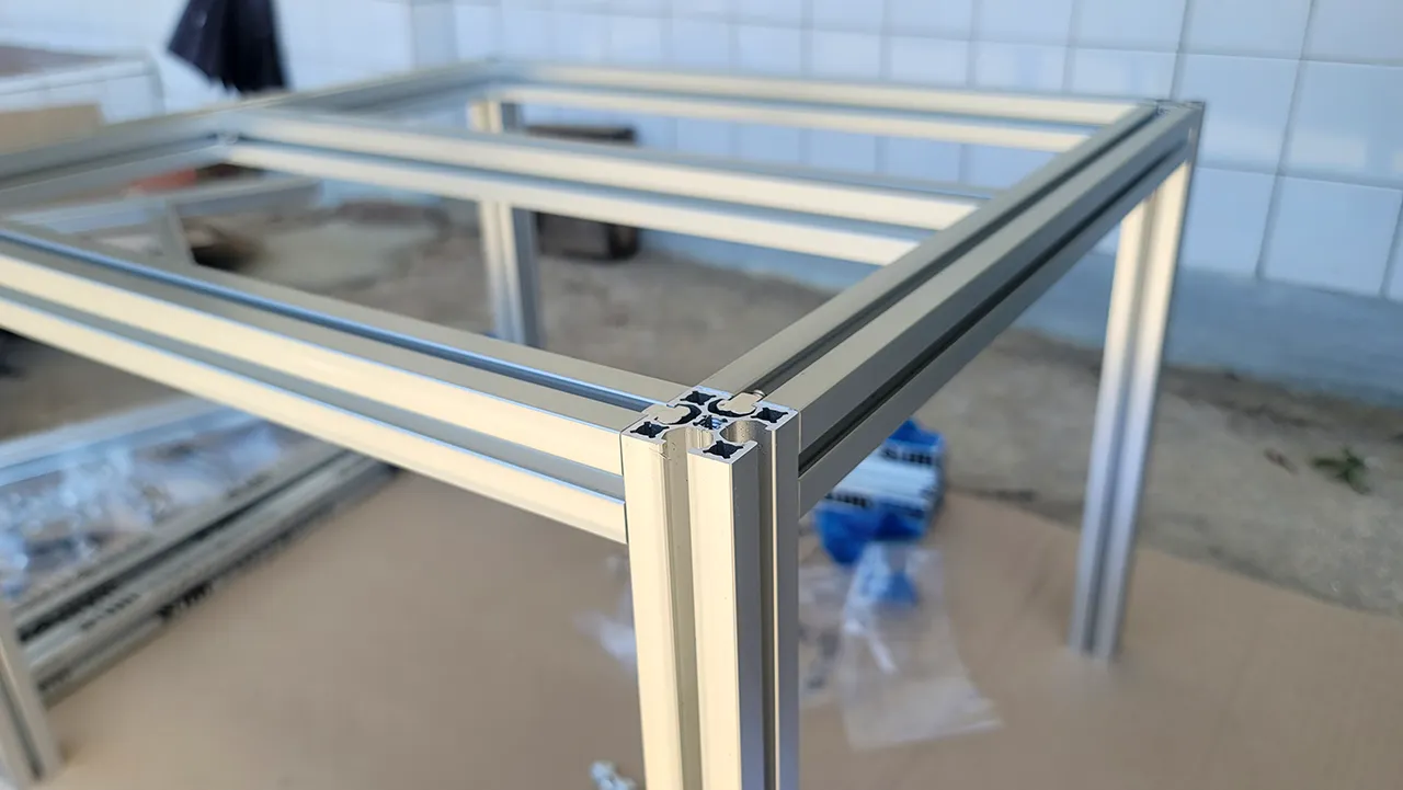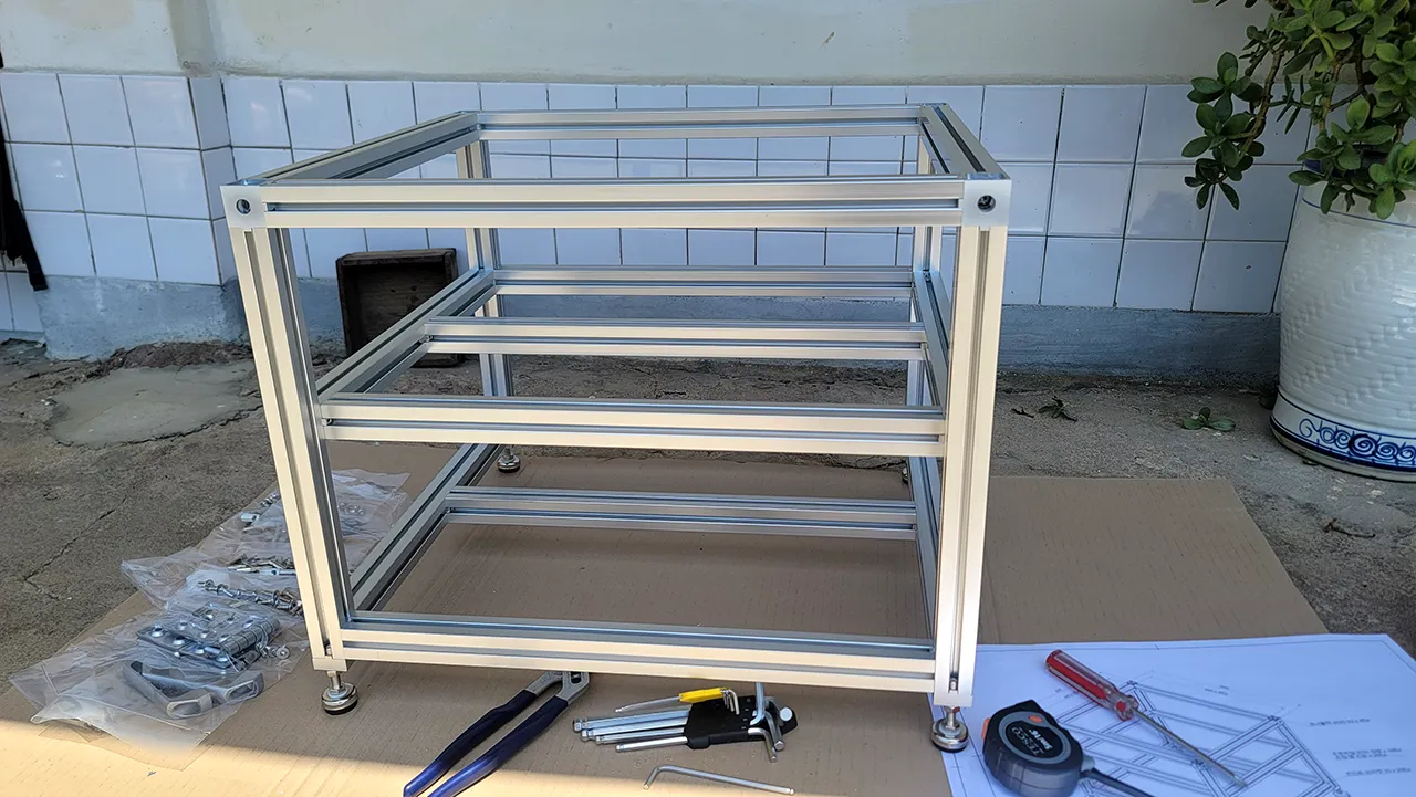 하부 조립이 끝난 후, 중간 프레임 구조를 넣고, 상부 코너블록과 프로파일을 이용해서 전체적인 구조를 조립한다.