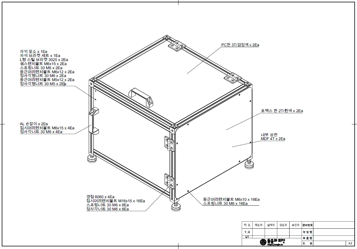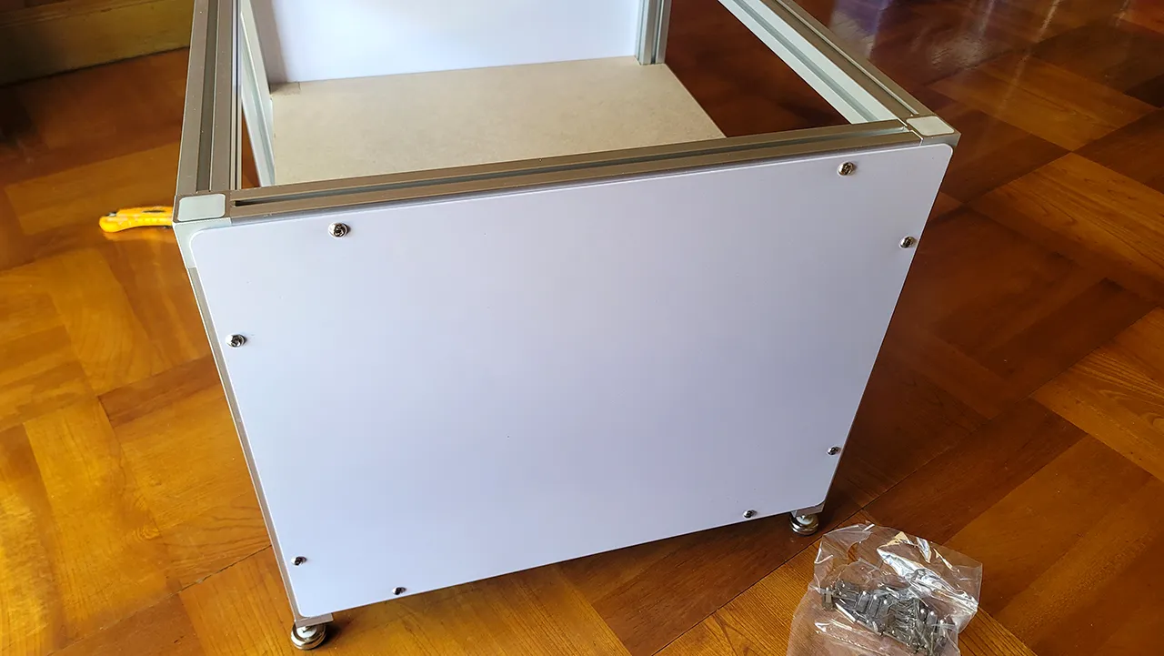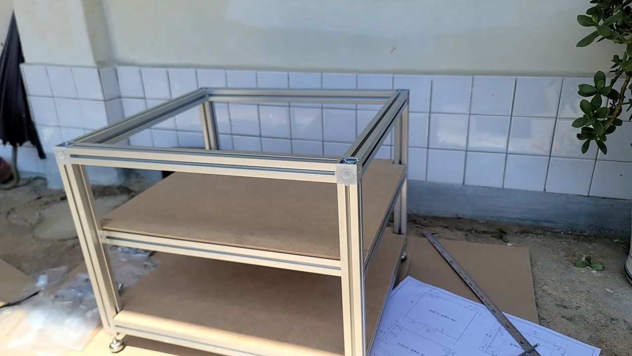 구조 조립은 알루미늄 프로파일과 스마트 부품(조인트 브라켓 30)으로만 이용해서 조립하고, 풋베이스와 레벨링 풋으로 다리를 설치하고, 조립 중간에 판재를 넣어 1차 구조를 완성하고, 최종적으로 포맥스와 PC판을 이용해서 측면과 뚜껑을 설치 완성했다.