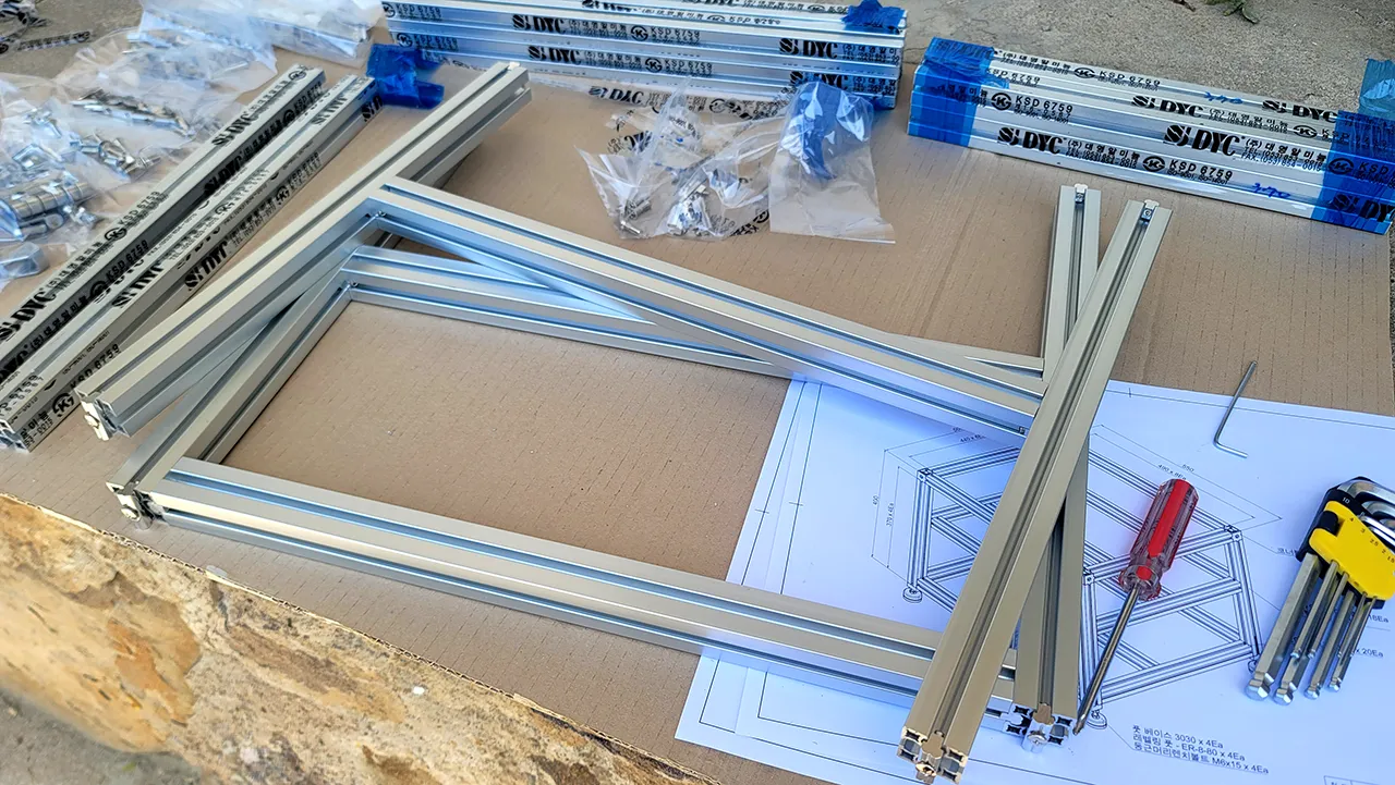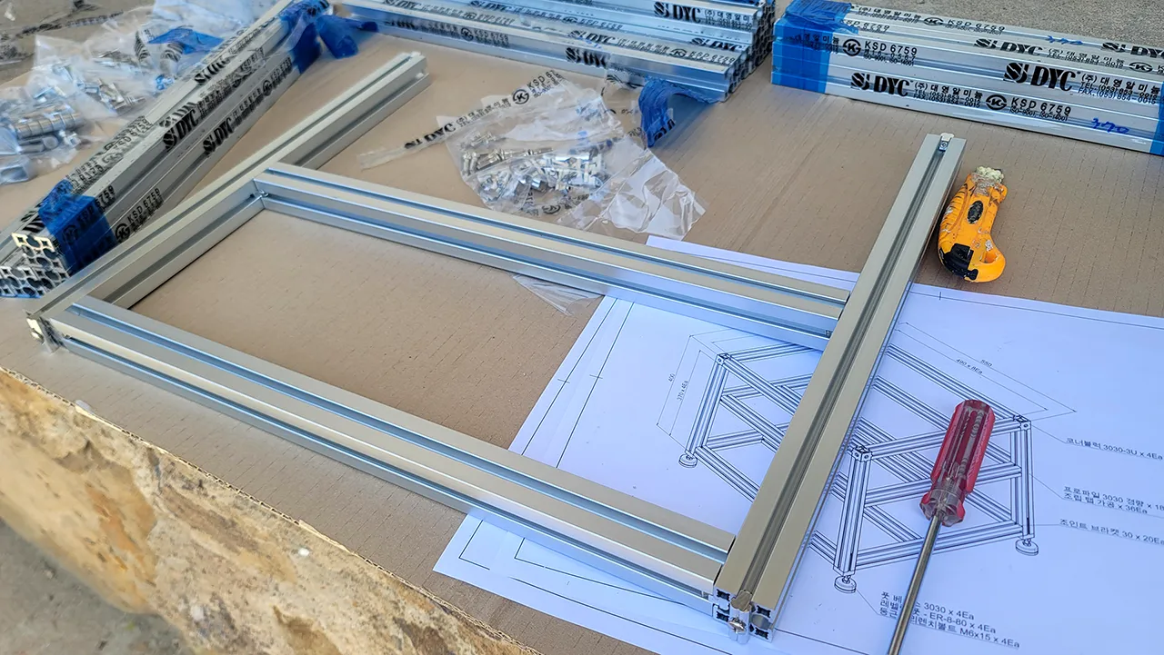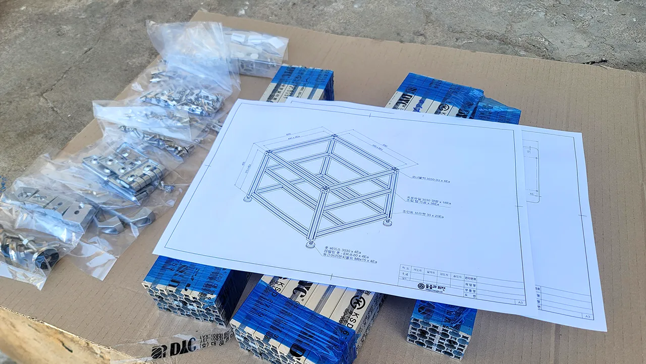 가장 중요한 프로파일 및 조립 부품은 부품다모아(https://hitc.kr/)에서 구매했으며, 알루미늄 프로파일은 주문 시 원하는 길이 단위로 정확하게 제단 해주는 것뿐만 아니라, 특허를 통해 독점 판매하고 있는 스마트 부품으로 조립하면, 정말 깔끔한 프로파일 구조를 만들 수 있는 장점이 있다.
