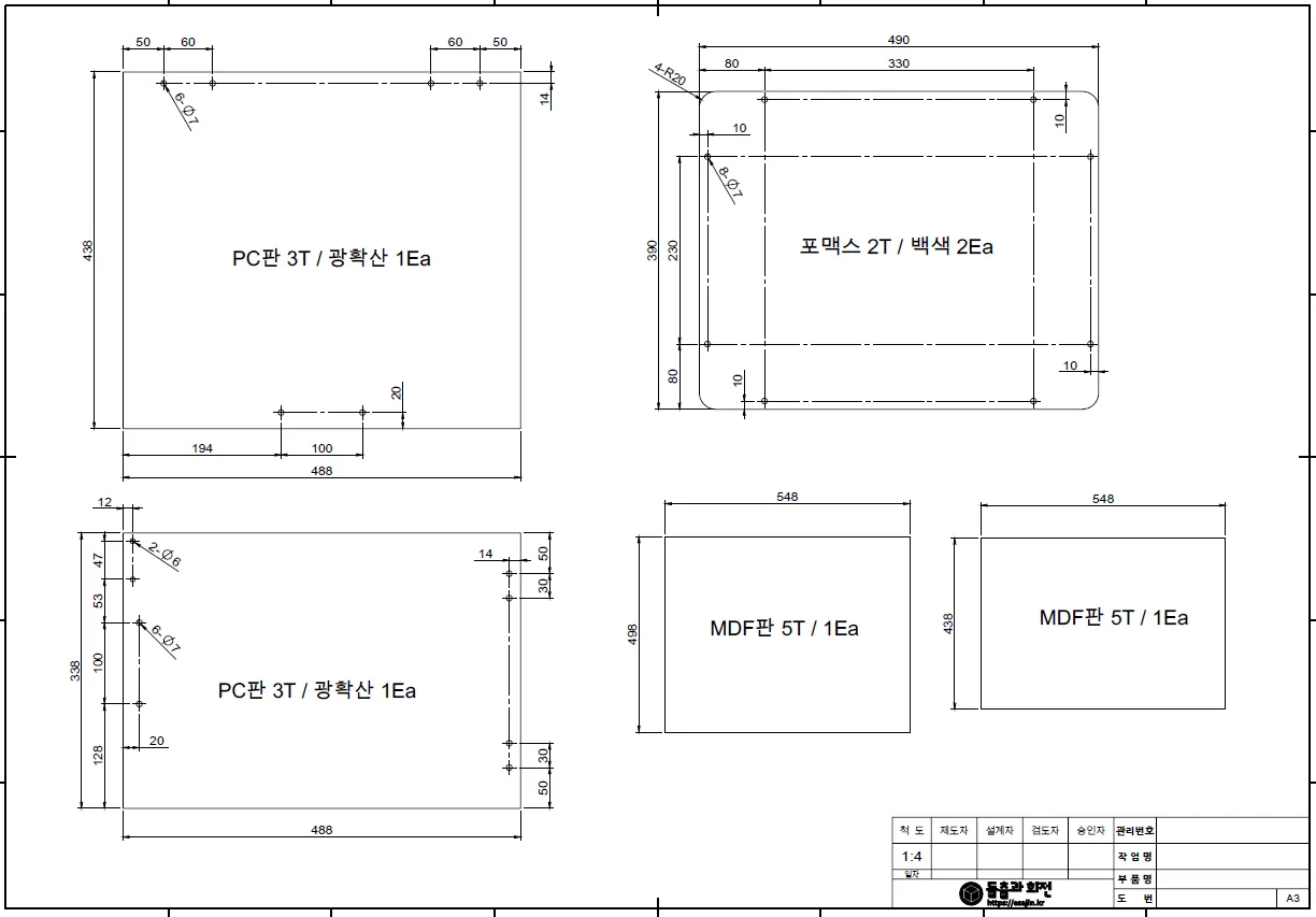 포맥스 및 PC(폴리카보네이트) 판은 아크리애(https://www.acryiae.com/)에서 설계 시 작성한 크기로 주문이 가능하고, 저렴하고 손쉽게 주문할 수 있는 장점이 있다.