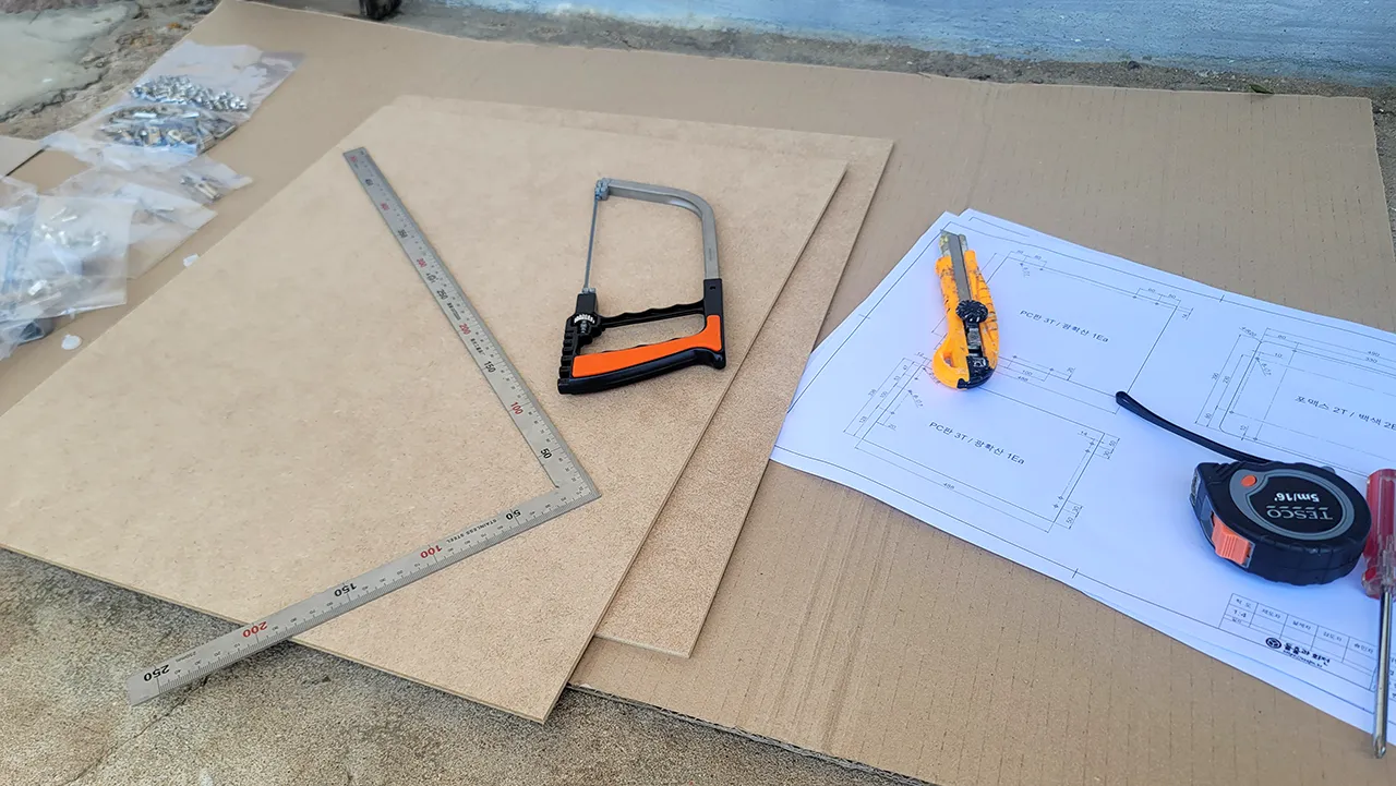 MDF이기 때문에 큰 힘과 많은 공구는 필요 없고, 쇠톱 또는 일반적인 톱으로 가로세로 30mm씩 코너를 잘라내면 된다.