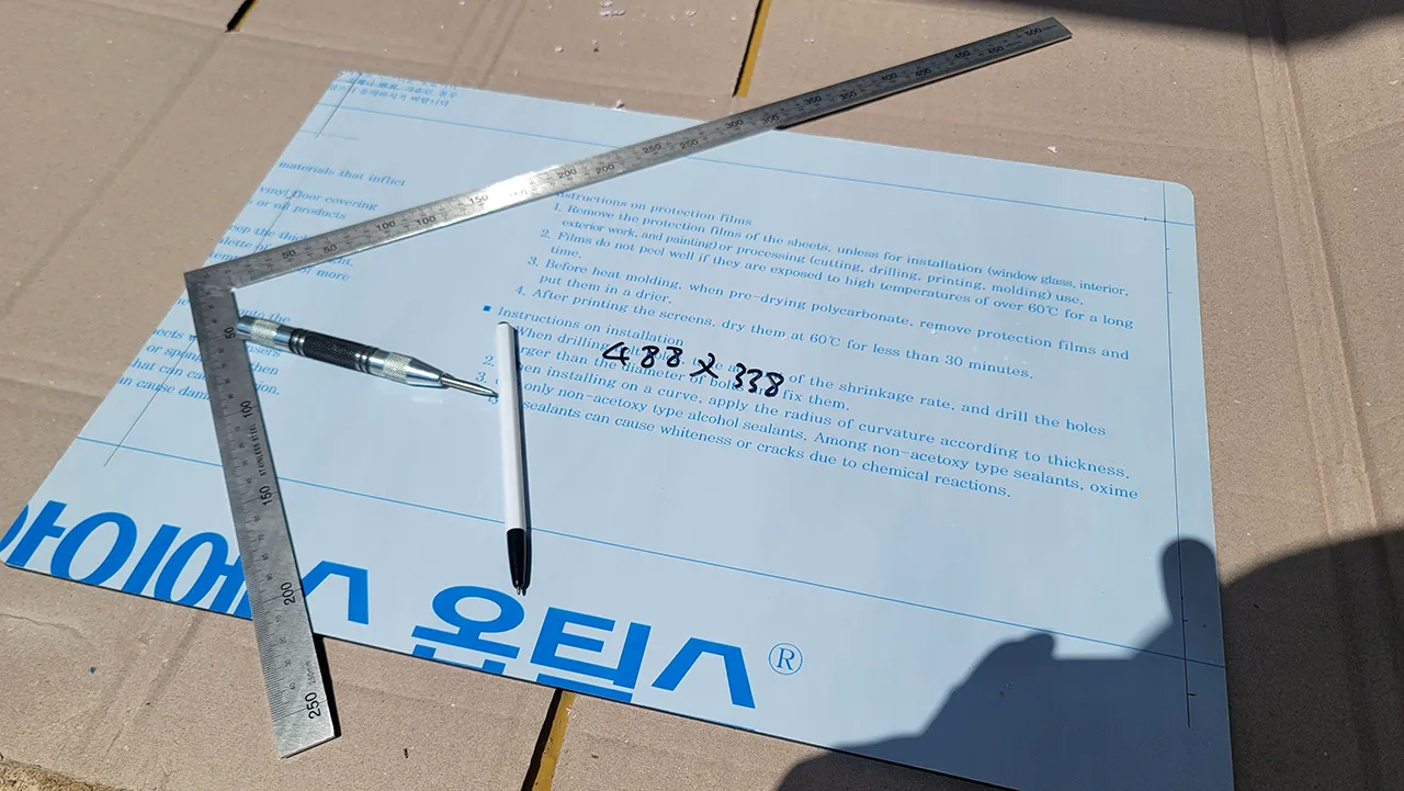 고향집에서 조립하는 것이라, 바깥에서 프로파일에 흠집이 발생하지 않도록 판재 배송 시 사용한 포장 골판지를 이용해서 바닥도 깔아 둔다.