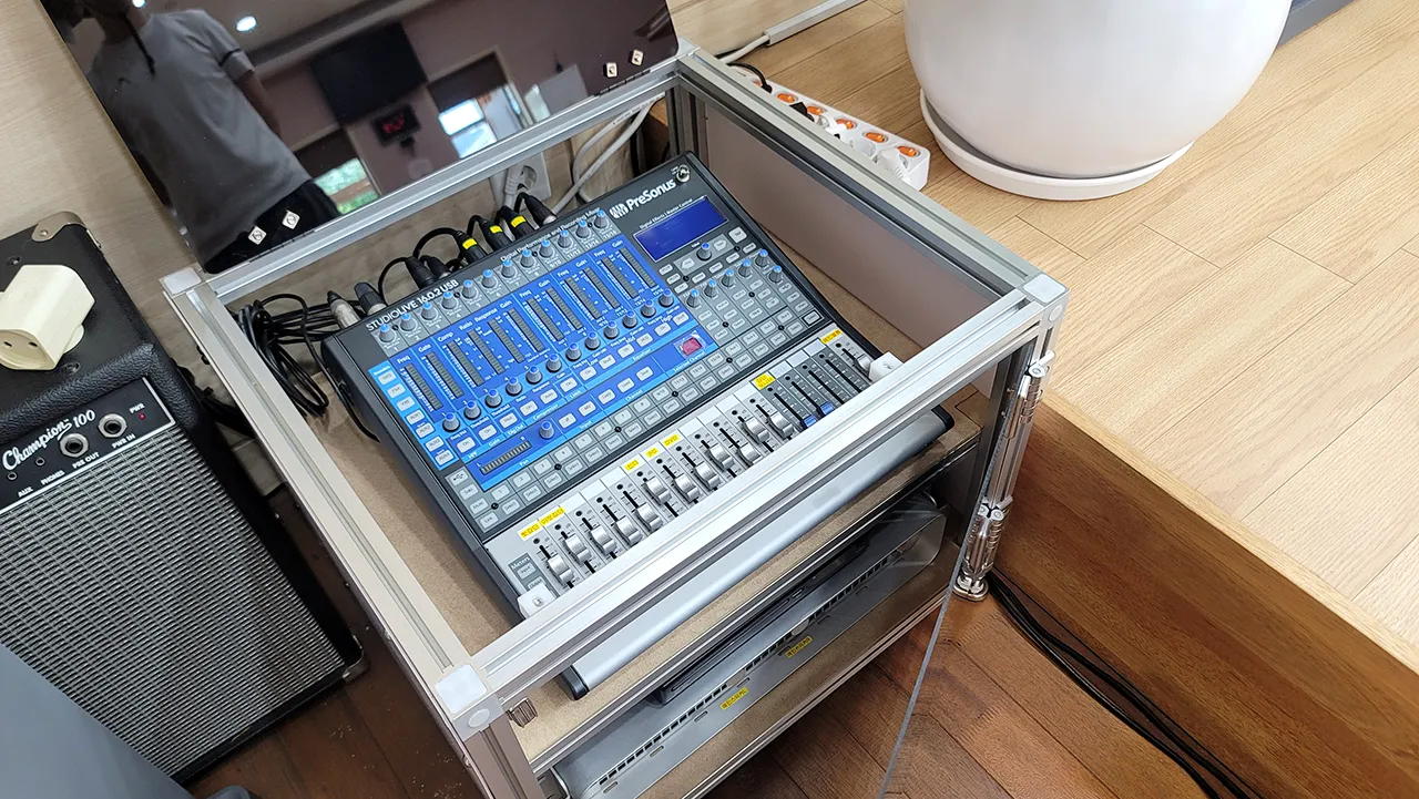 기존 오디오 믹스 선반을 빼내고, 새롭게 만든 렉 케이스에 아래층에는 앰프를 넣고, 위 층에는 믹스를 설치했다.