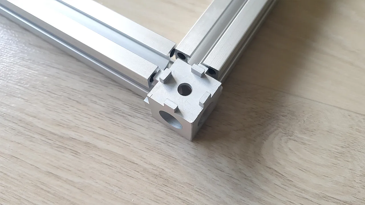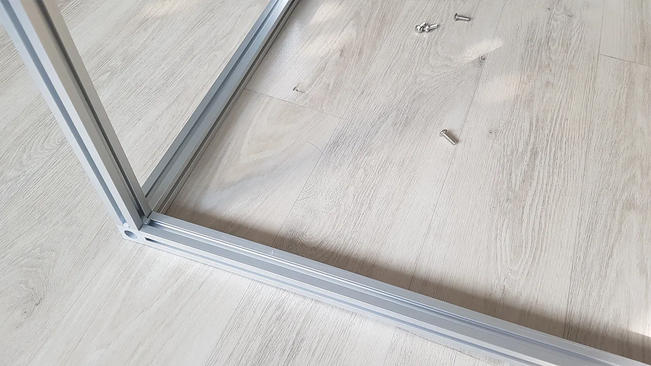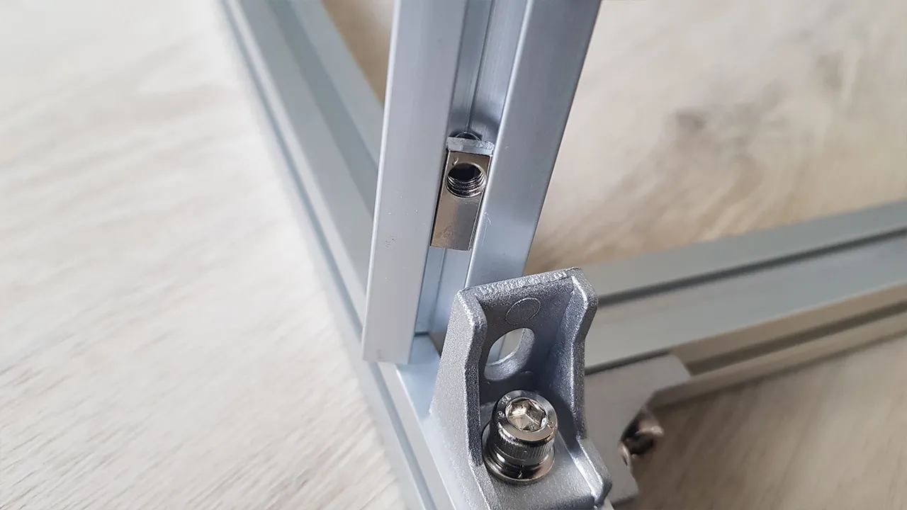 프로파일 터널에 코너 블록의 홈과 맞추고 둥근 머리 볼트로 조이기만 하면 되지만, 흔들림이 없도록 하기 위해서 조금 강한 힘을 주어야 한다.