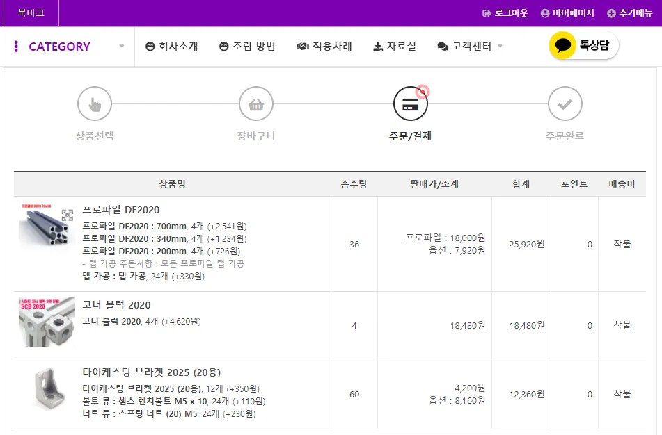 또한, 이 쇼핑몰의 장점은 프로파일의 계열 크기별로 프로파일과 부속 부품을 묶어두고 있어, 프로파일의 크기만 정해지만 부품 선택이 다른 쇼핑몰보다 훨씬 간편하고 좋다는 것이다.