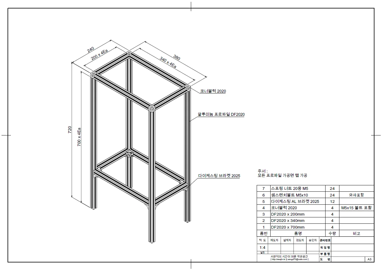 부품 주문은 꽤 신박한 조립부품을 판매하고 있는 부품다모아(https://hitc.kr)라는 쇼핑몰에서 주문했는데, 프로파일이나 일반적인 조립 부품 같은 경우는 거의 모든 쇼핑몰에서 판매하고 있지만, 코너 블록 등과 같은 조인트 브래킷, 인서트 브래킷 같은 스마트 조립 부품들은 이곳에서만 독점 판매하고 있는 것 같았다.