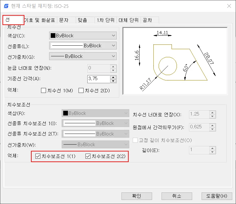 치수 선 탭에서는 치수 선과 치수 보조선에 대한 억제 부분만 재지정하는 것을 추천한다.
