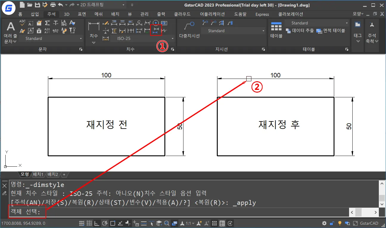 치수 스타일 재지정 및 치수 시스템 변수 값 변경 후, 치수 객체 적용 방법