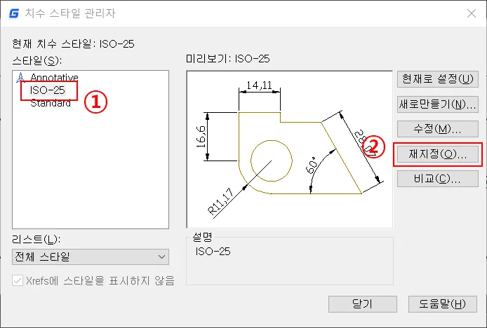 치수 스타일 관리자를 통한 치수 재지정 방법