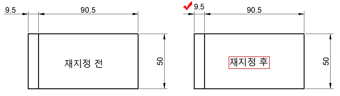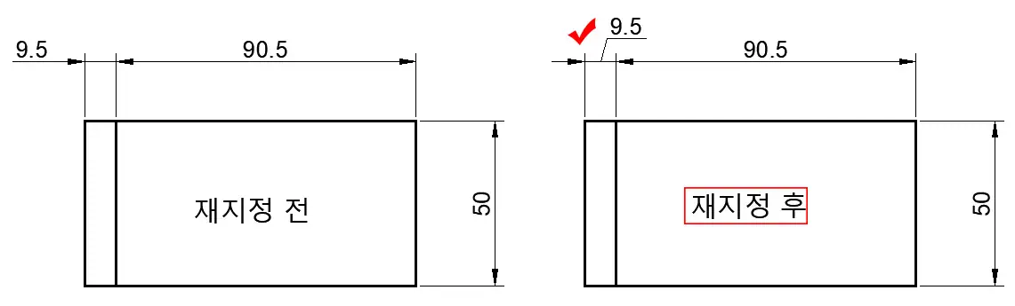 치수 스타일 관리자를 통해서 치수 스타일을 변경하는 스타일 변경 후, 필요한 치수 객체를 선택하여 일괄적으로 재지정할 수 있고, 재지정 이후, 도면에 치수를 기입하면 재지정된 스타일이 치수 객체에 적용된다.
