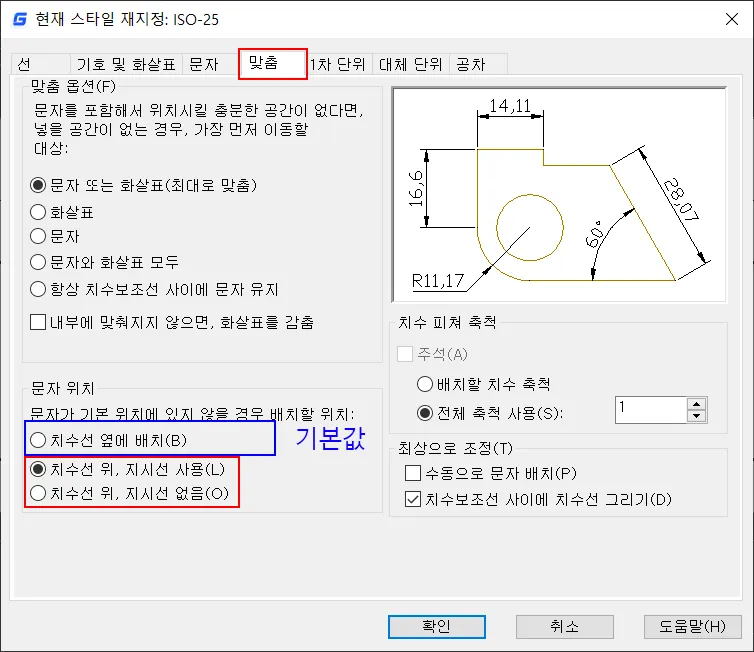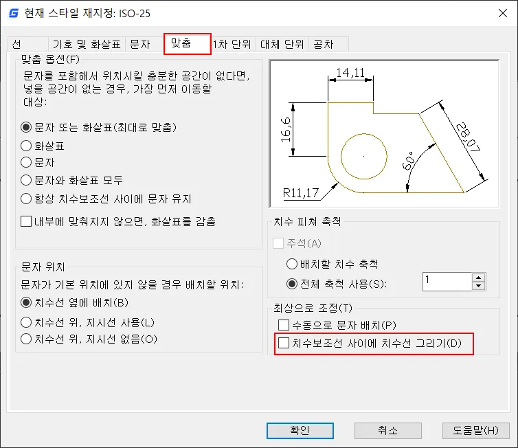 맞춤 탭에 있는 옵션 내용은 치수 보조선 사이의 간격에 따라 치수 위치 및 치수선 및 치수선 화살표를 어떻게 표현할 것인 가를 지정하는 옵션들의 모음이다.