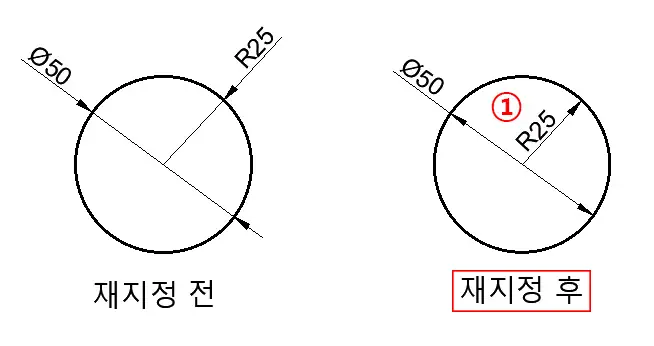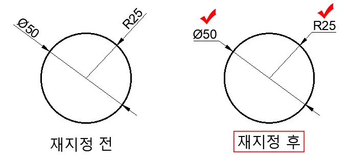 선형 치수인 경우에서는 거의 사용하지 않는 옵션이지만, 지름/반지름 치수에서는 상황에 따라 적절하게 재지정으로 변경해서 사용한다.