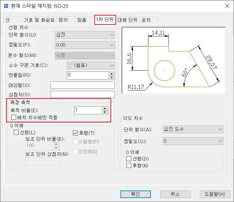 측정 축척은 상세도와 같이 축척(SCALE) 명령으로 확대 또는 축소된 도면을 축소 확대 배율로 줄이거나 키워서 값을 설정하여 실제 도면 크기값을 유지할 수 있도록 만들어주는 옵션이다.