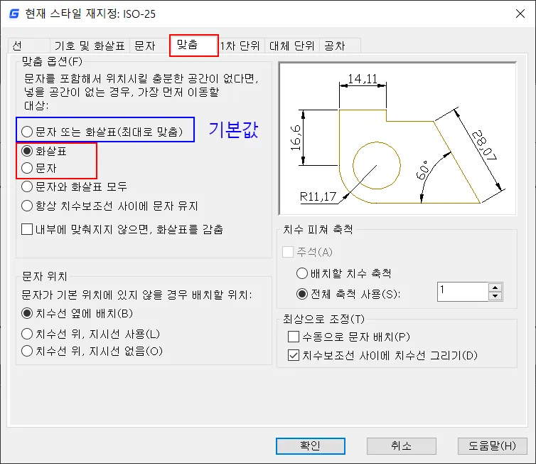 문자 또는 화살표(최대로 맞춤)를 기본값으로 사용하고 있으며, 치수 문자의 위치에 따라 또는 치수 보조선의 간격에 따라 화살표, 문자, 문자와 화살표 모두 등의 옵션으로 변경해서 사용할 수 있다.