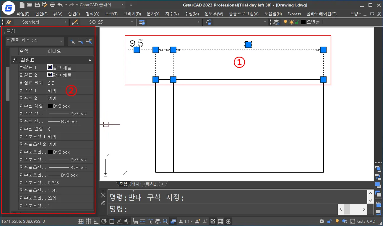 특성창을 이용한 치수 재지정 방법은 기입된 치수를 선택한 후, 특성창에서 변경하고자 하는 치수 옵션을 설정해서 변경하는 방법이지만, 간단하게 두어 개씩 변경할 사항이면 편리하지만, 많은 양을 다뤄야 하는 경우에는 많은 불편함이 있다.