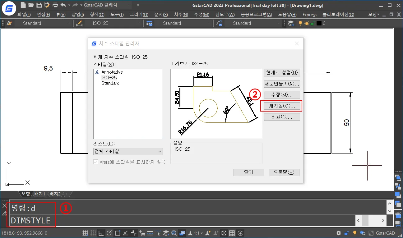 이번 강좌의 핵심이 되는 부분으로, 치수 기입 전에 무조건 사용해야 하는 치수 스타일 관리자를 통해서 재지정 치수 스타일을 변경할 수 있다.