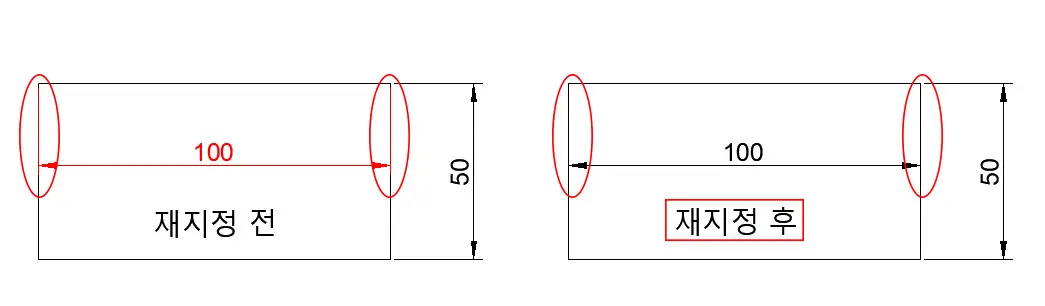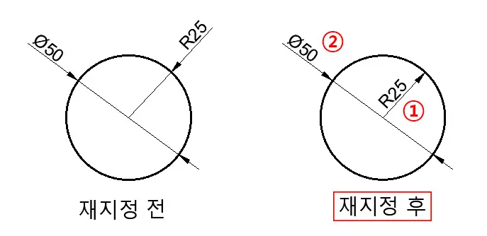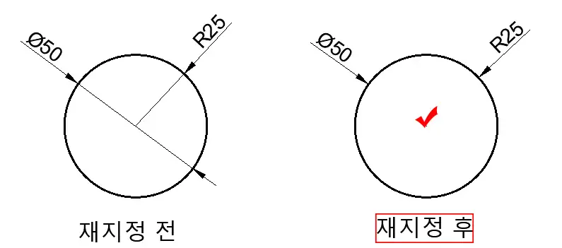 선형 치수인 경우에서는 거의 사용하지 않는 옵션이지만, 지름/반지름 치수에서는 상황에 따라 적절하게 재지정으로 변경해서 사용한다.