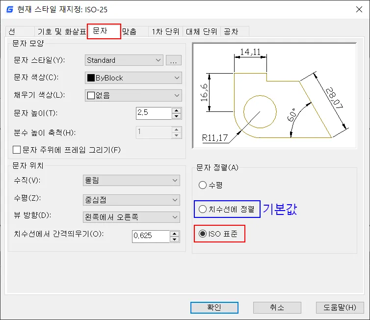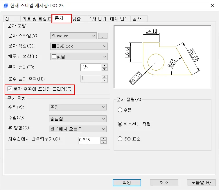 문자 정렬은 치수 문자를 치수선과 함께 도면상에 어떻게 표현할 것인지를 결정하는 내용이다.