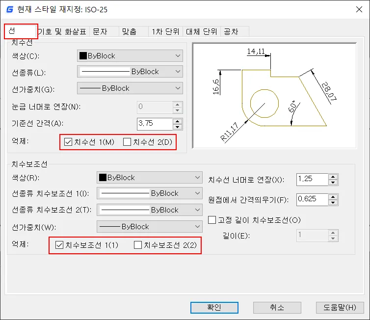치수 선 탭에서는 치수 선과 치수 보조선에 대한 억제 부분만 재지정하는 것을 추천한다.