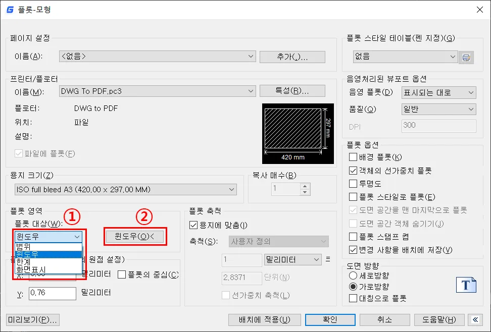 ※ 만약, 용지크기를 전체 페이지로 설정하고, 도면을 용지에 맞춤으로 출력하는 경우에는, 플롯 영역에서 윈도우로 도면 경계 영역을 선택하는 것이 아니라, 종이 영역을 선택하는 것을 추천한다.