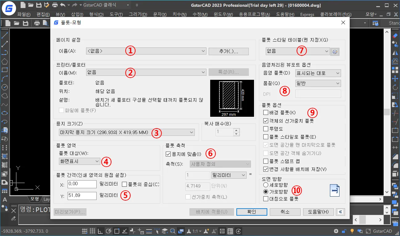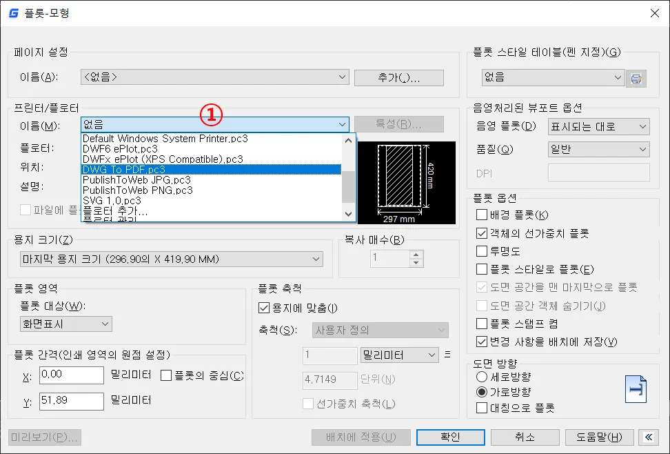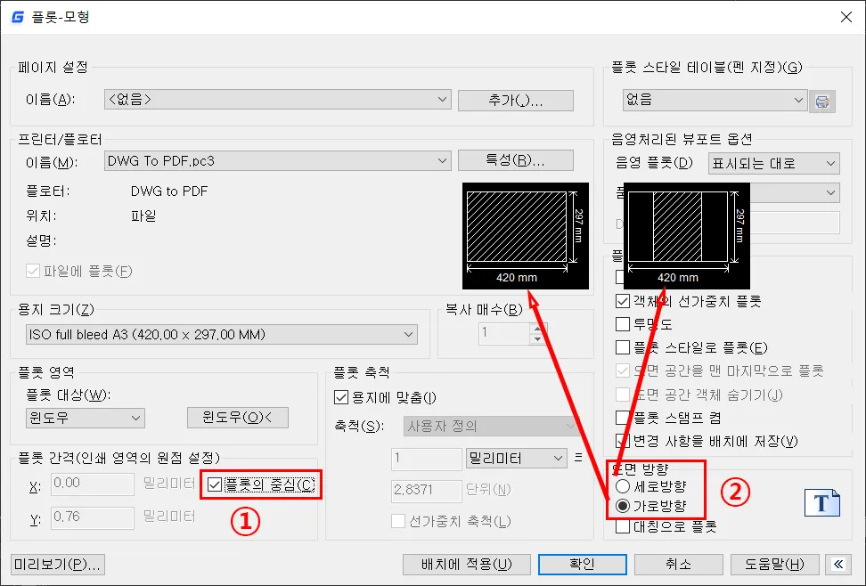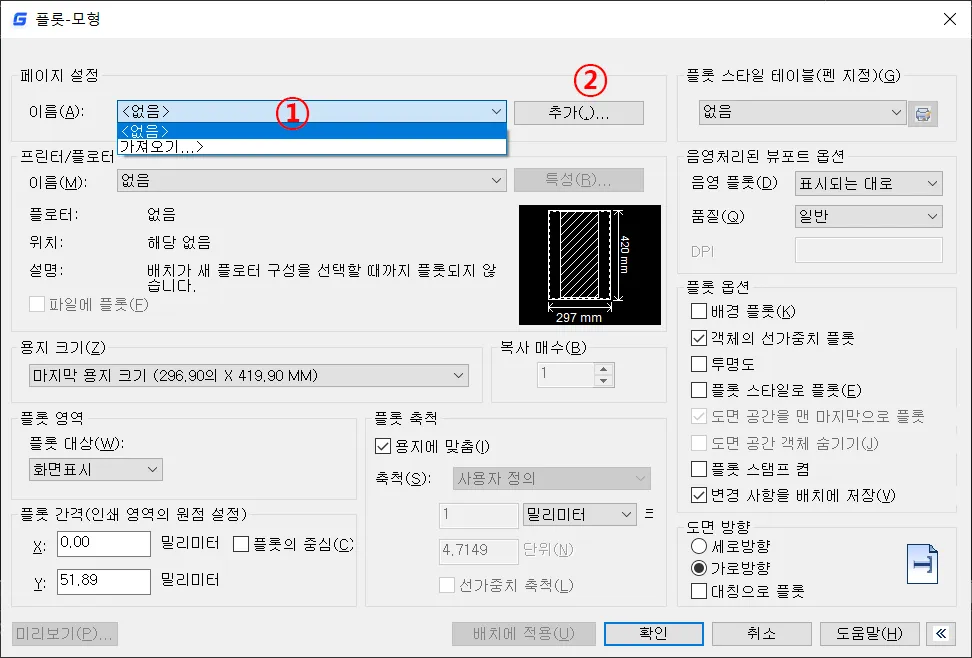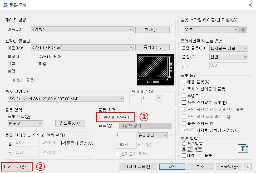 도면 방향은 설정된 용지 크기와 플롯 영역에 따라 가로 또는 세로의 위치가 변경되는 것을, 용지의 출력 방향에 맞게 수정하는 기능을 가지고 있으며, 이것은 프린터/플로터 영역 옆에 있는 미리 보기를 통해서 변경하면 된다.
