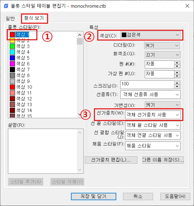 ※ 검은색으로 설정되어 있기 때문에` monochrome.ctb`을 사용하면 흑백으로 출력되는 것이다. 만약, 객체 색상 사용 또는 다른 색으로 설정되어 있다면, 객체 색상 사용은 도면에 설정된 색으로 출력되고, 다른 색으로 되어 있다면, 해당 색상으로 출력된다. - 선택된 `색상 1번`의 특성 중 출력될 때, 선가중치를 변경하는 부분으로 쉽게 `선 굵기`를 바꿀 수 있다.