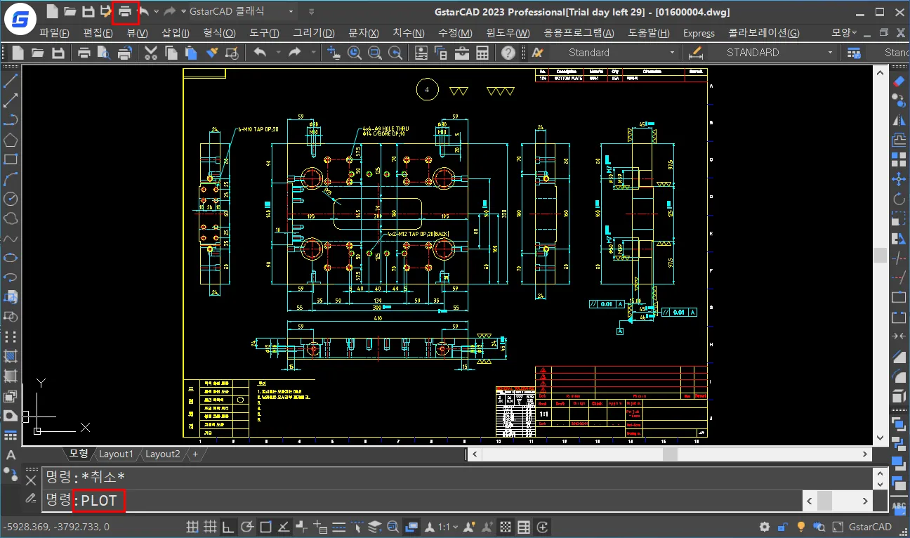 프린터/플롯 관리자 창 실행은 명령에서 plot(단축키 없음) 또는 상단에 바로가기 아이콘에서 프린터 아이콘을 클릭하거나, Ctrl+P를 누르면 플롯 대화상자가 작동한다.