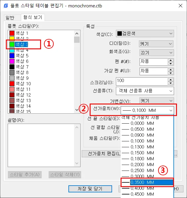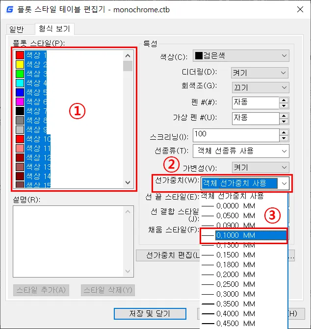 - 모든 플롯 스타일에 따른 특성을 변경했다면, 저장 및 닫기를 클릭해서, 플롯 대화상자로 넘어간다.