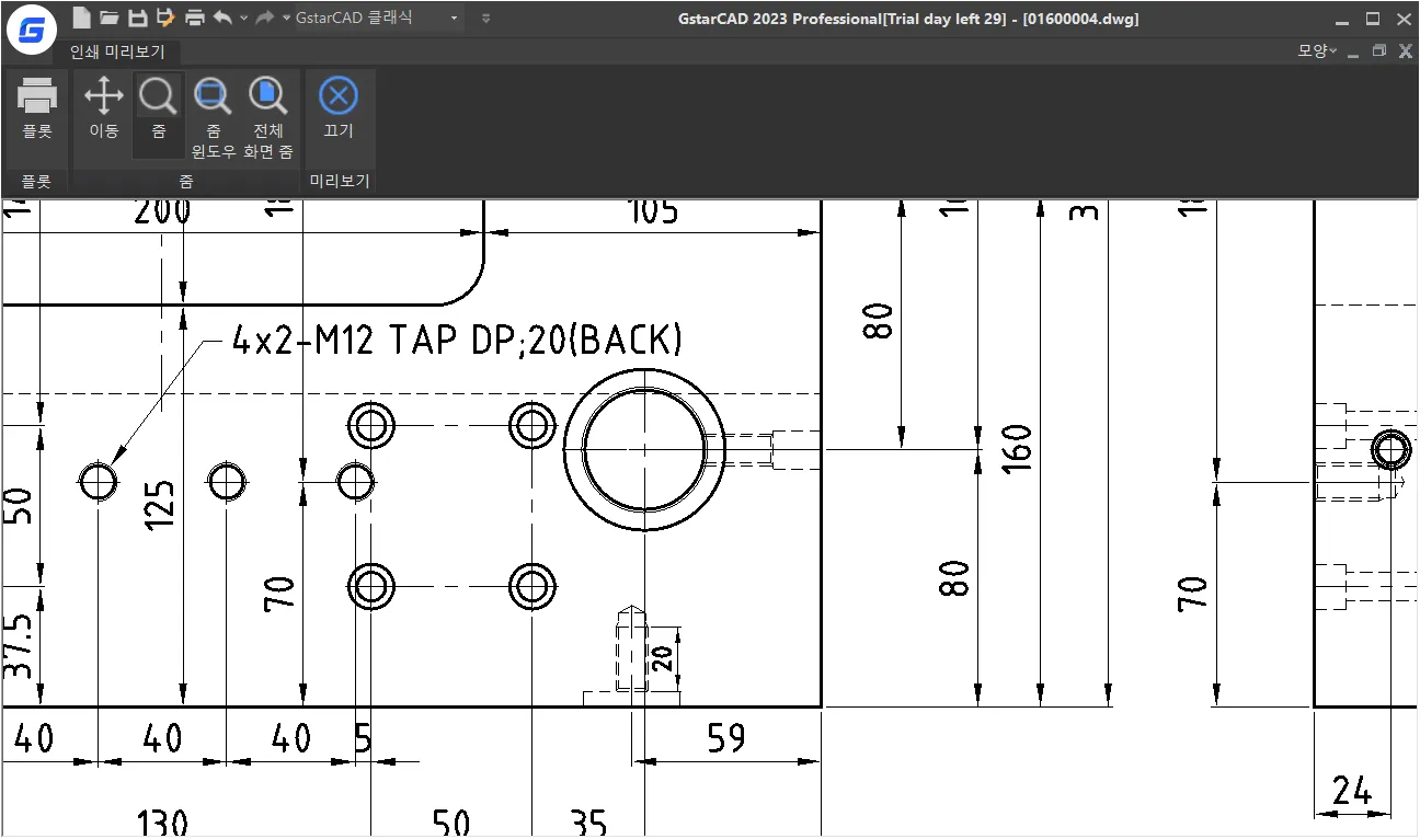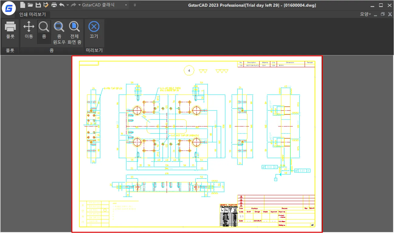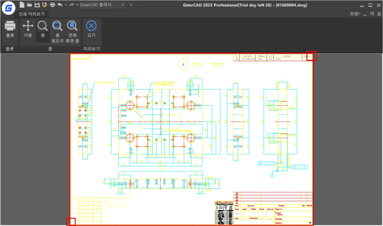 - 척도를 `1/4`로 설정한 후, 미리 보기 창에서 확인했을 때, 도면의 경계가 용지를 조금 넘어섰다는 것이 보인다.