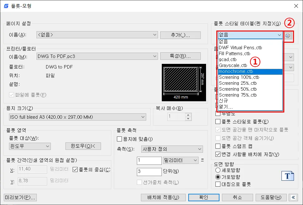 - 플롯 스타일 테이블에서 원하는 `CTB`파일은 선택한다. 기본적으로 칼러로 도면을 출력하는 경우에는 `acac.ctb`를 사용하고, 흑백으로 출력하는 경우에는 `monochrome.ctb`를 사용하면 된다. 여기서는 `monochrome.ctb`로 흑백 출력하는 내용으로 설명한다.