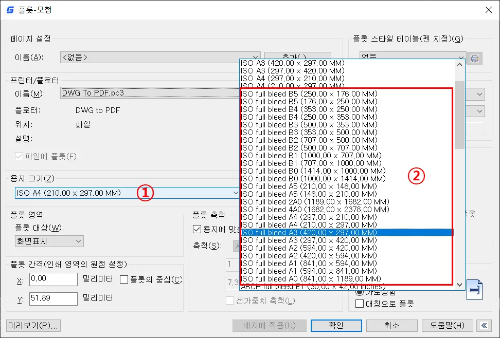 ※ 출력 장치가 PDF인 경우, 지원하는 모든 국제규격 용지를 다 사용할 수 있지만, 가능하면, ISO 전체 페이지(오토캐드 인경우) 또는 ISO full bleed(지스타 캐드인 경우)에 해당하는 용지를 선택하는 것을 추천한다.