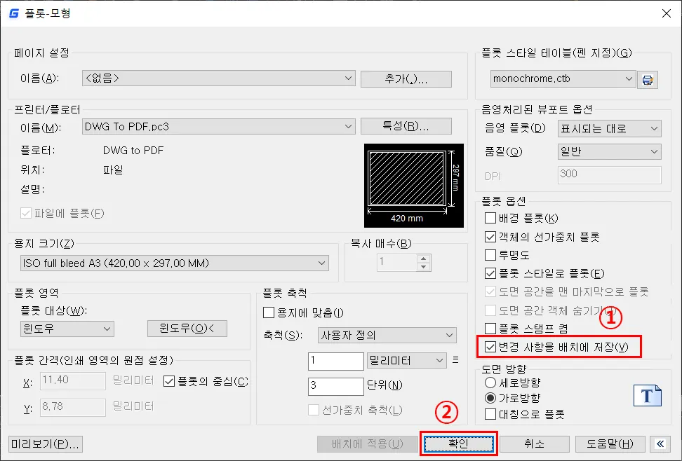 - 플롯 옵션에서 변경 사항을 배치에 저장은 선택해 두면, 매번 플롯 설정을 변경할 때마다 배치에 적용 버튼을 클릭하지 않아도, 자동으로 설정값이 저장되지만, 취소하는 경우에는 변경 사항을 배치에 저장하지 않는다.