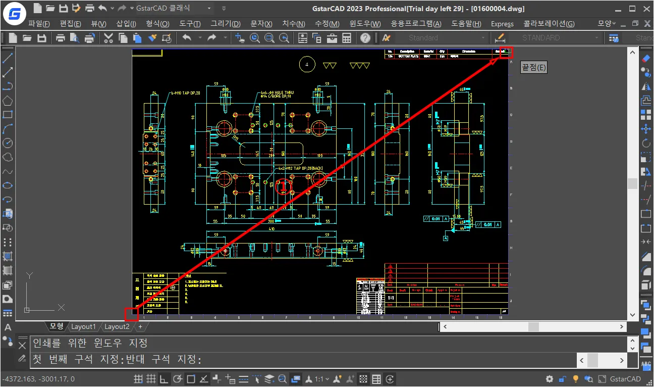 도면은 무조건 `1/4`로 출력되지만, 이렇게 선택한 영역이 용지를 넘어서거나, 남는 경우는 용지가 도면 경계가 임의 크기로 변경되었거나, 척도 값이 맞지 않는 경우이다.