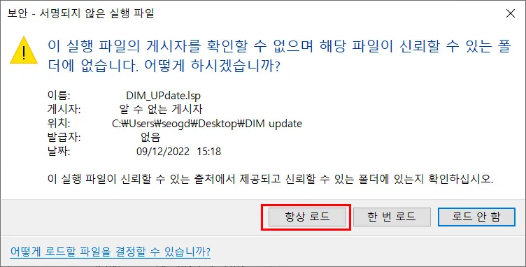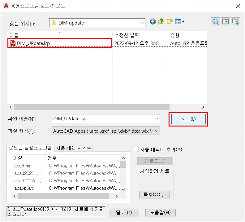 현재, 활성창에 DIM_UPdate.lsp 탑재를 위해 리습 파일을 선택하고, 로드를 클릭한다.