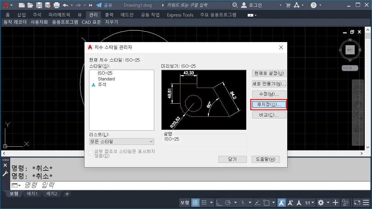 dimstyle(단축키 D)를 실행하고, 현재 스타일을 재지정으로 치수 스타일을 편집한다.