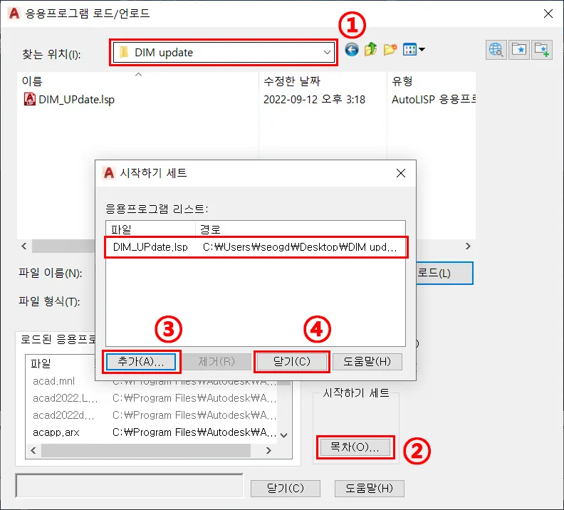 ③ 추가 버튼을 클릭해서, 오토캐드가 실행될 때 자동으로 불러들일 "DIM_UPdate.lsp" 파일을 추가한다.