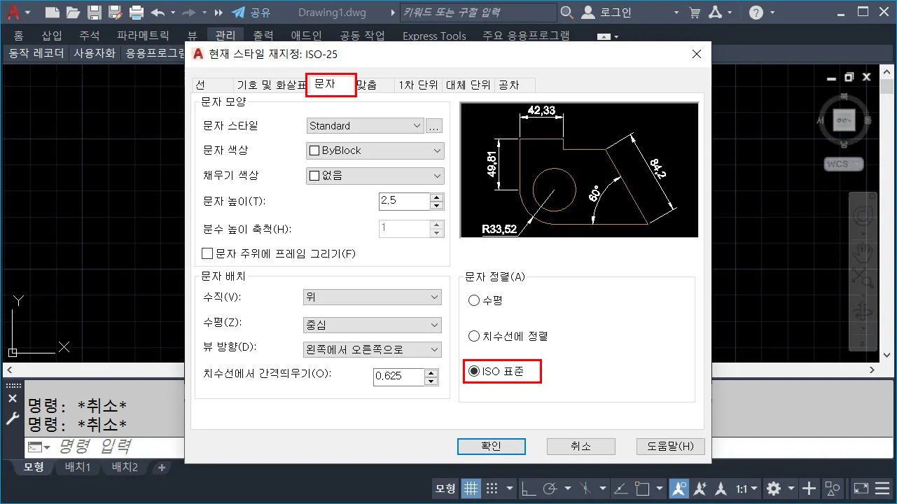 스타일 재지정 탭에서 문자 탭을 클릭하고, 문자 정렬을 ISO 표준으로 변경하고, 확인 및 닫기 한다.