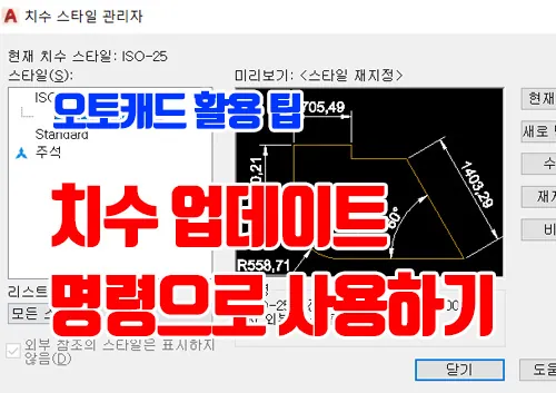 치수 업데이트 기능은 치수 스타일(dimstyle)에서 재지정(Override)을 통해 변경된 치수 스타일 옵션을 이미 기입된 치수에 업데이트 적용하기 위한 기능이다.