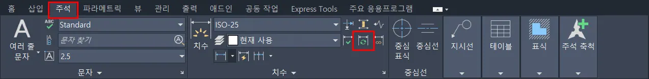 치수 스타일 재지정 기능은 현재 치수 스타일을 변경하지 않고, 치수 기입 시스템 변수를 임시로 변경하는 기능으로, 치수 스타일 중에서 일부분을 재정으로 사용하면 편리하다.