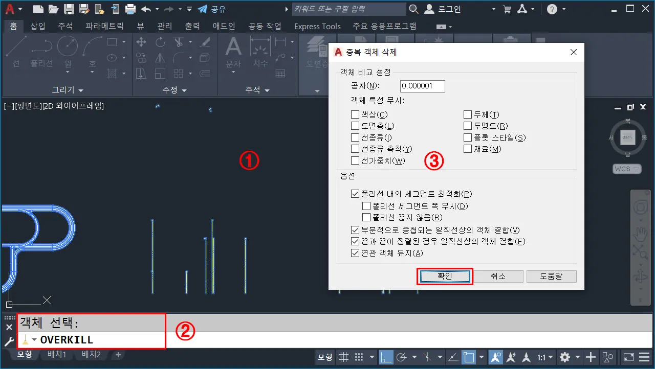 - `Ctrl+A` 또는 해당 도면을 `드래그 선택`한 다음, `OVERKILL`(기본 단축키 없음, 중복 객체 삭제) 명령을 입력하고 엔터 한다.