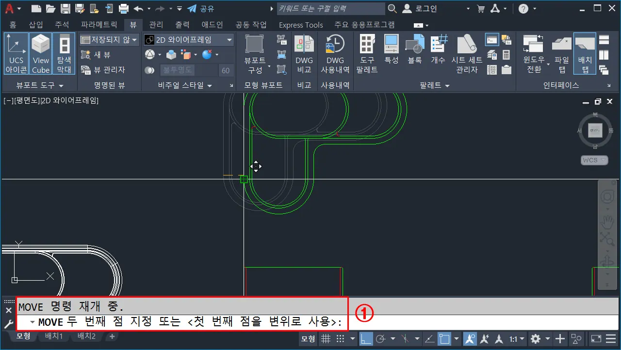 - 명령 창에서 `PLAN`엔터, 엔터 하거나 뷰 큐브에서 평면 뷰를 선택하고, `-vp`엔터 `0,0,1` 엔터 하거나 사용자가 알아서 평면 화면으로 변경하면 된다.