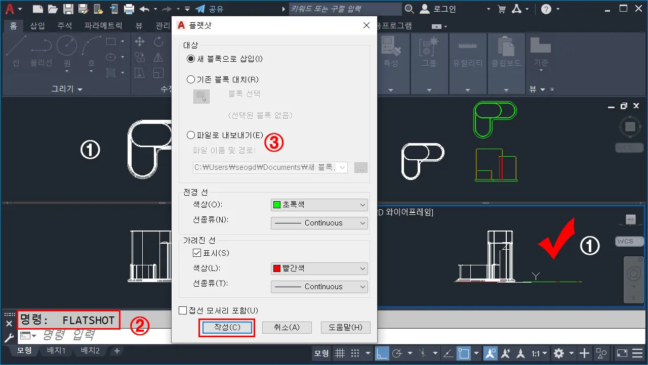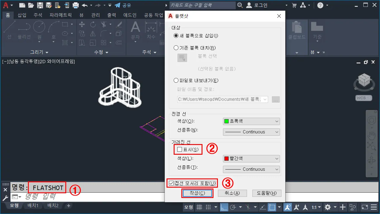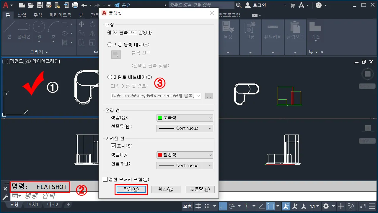 ※ 플랫샷으로 만들어지는 도면은 기본적으로 블록 정의된다. - 전경 선(외형선)과 가려진 선(숨은선, 파선)에 대한 선분 색상을 지정한다.