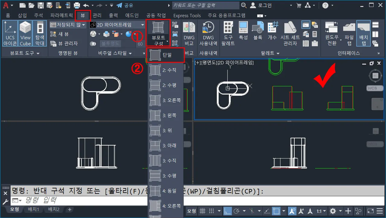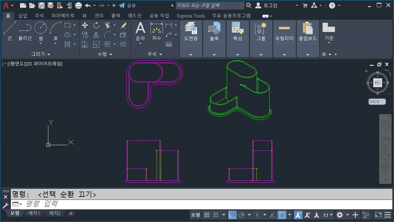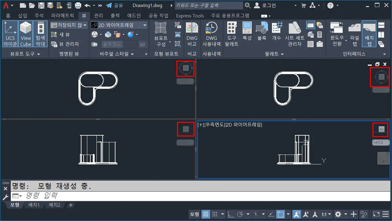 기본 싱글 화면에서 3D를 2D 정투상 도면을 내리는 것은 상당히 불편하기 때문에, `Viewport`(뷰포트, 명령:`vports`)를 이용해서 작업화면을 분할한다.