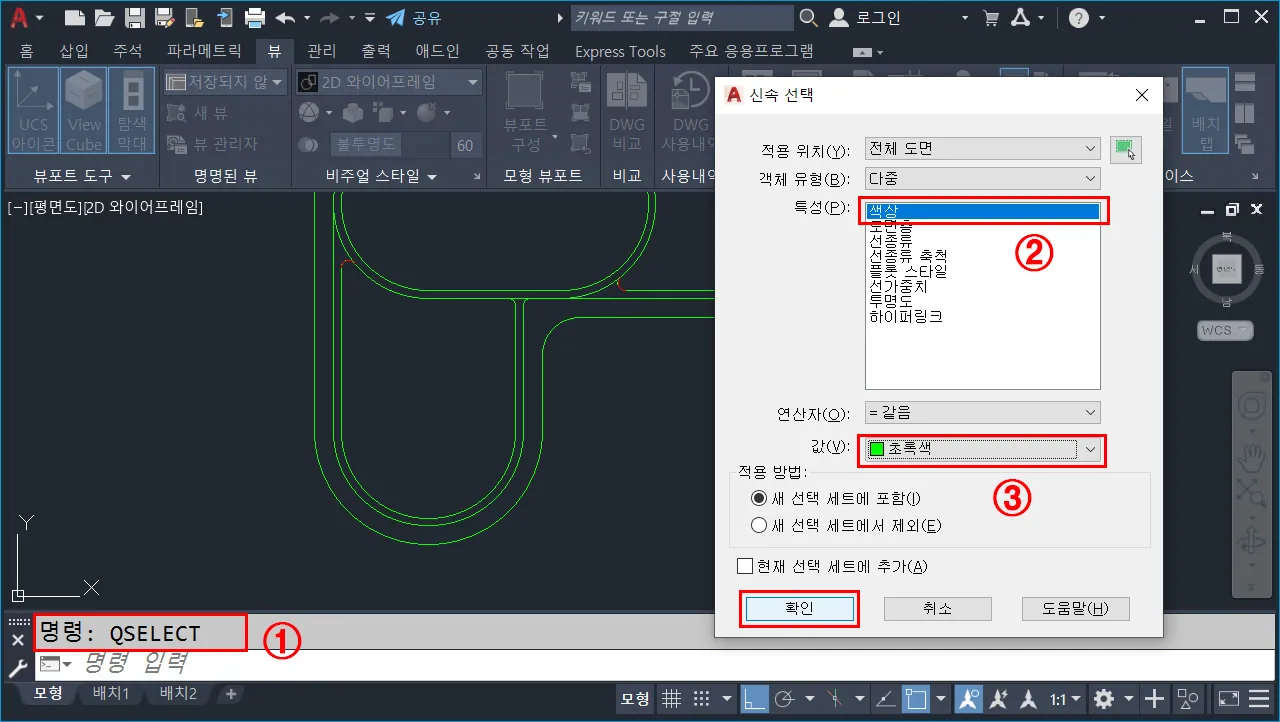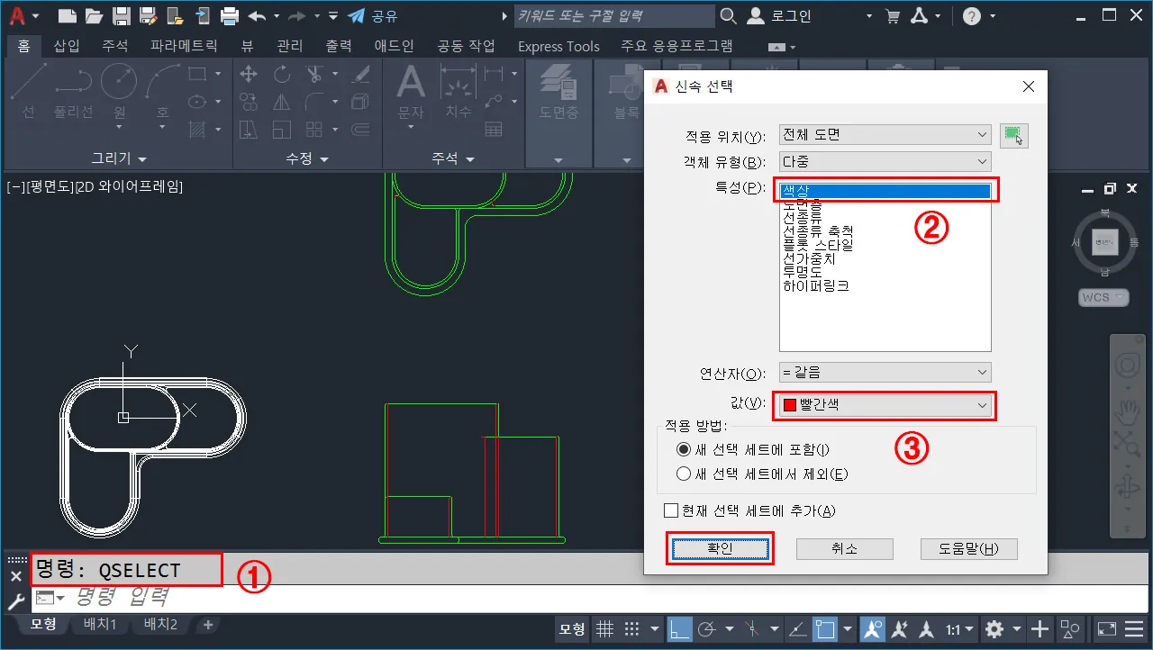 - 명령 창에서 `QSELECT`(신속 선택) 명령을 입력하고 엔터 한다.