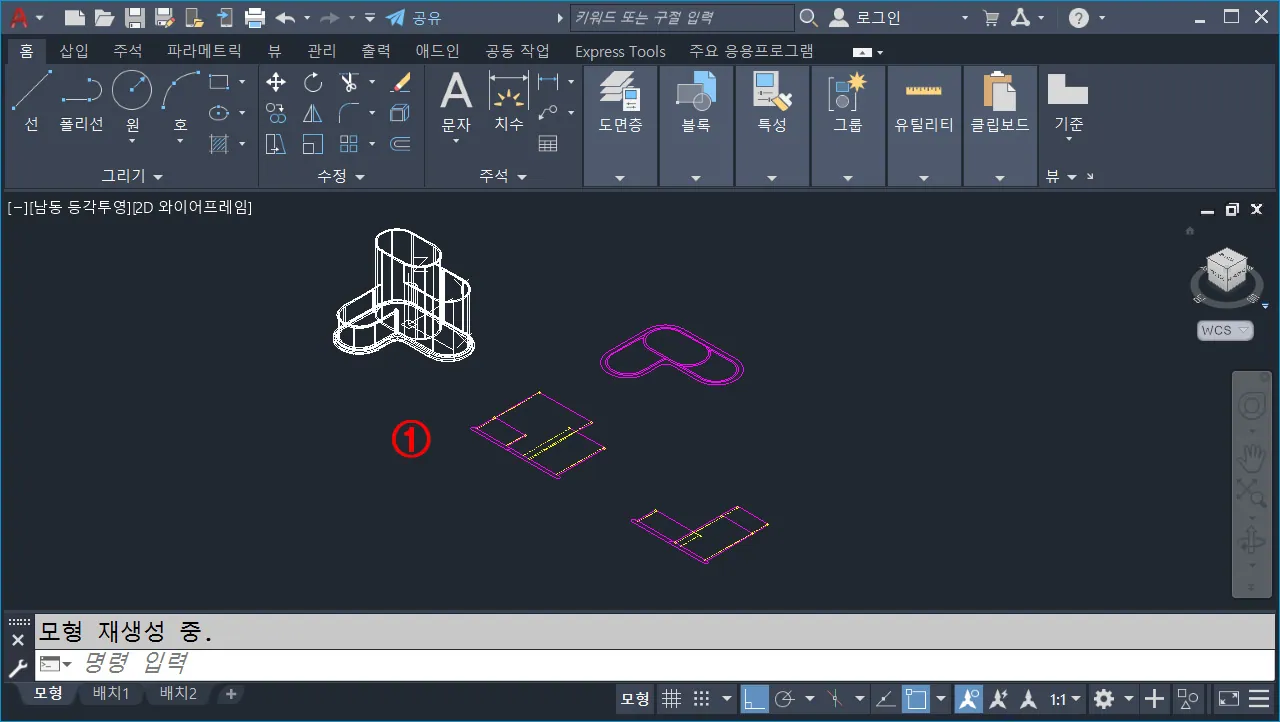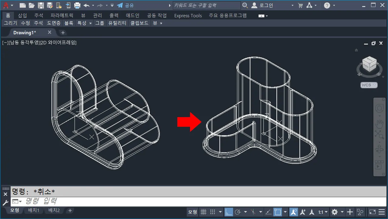 - `-VPOINT`(`-vp`, 화면 방향 변경) 또는 우측 상단에 있는 뷰 큐브를 이용해서 등각화면으로 변경한다.