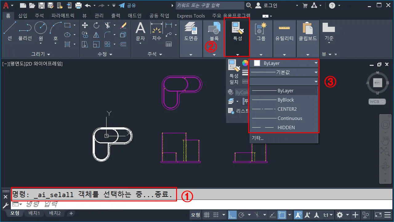 - 3 홈 메뉴, 특성에서 색상은 `ByLayer`로 변경하고, 선 가중치와 선 종류도 `ByLayer`로 전부 변경한다.